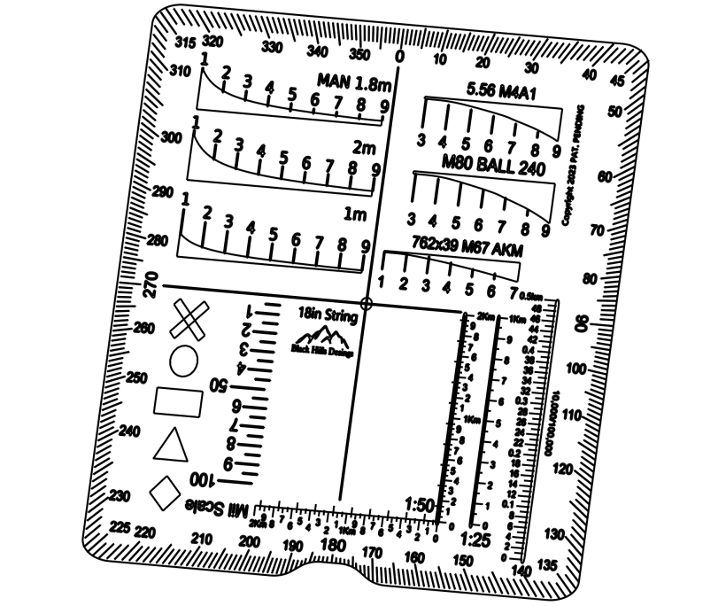 Similar in function to the world-famous PSO BDC reticle used on Combloc weaponry, the RANGE-R card gives off NO thermal, IR, EM or SWIR signature. With a bombproof design and small footprint, add a Black Hills Designs RANGE-R card to your gear today. At a svelte 5.375″ x 3″, the Black Hills Designs RANGE-R Card is built to fit anywhere in your kit. The RANGE-R Card gives you the ability to easily range out to 900m without the use of electronics, emissions of any kind, or dependence on GPS. The RANGE-R Card can be used as a standalone ranging solution or combined with traditional ranging mechanisms (laser range finding, GPS, milling, etc.) to improve the accuracy of a given range. The flexible card is perfectly sized for a BDU pocket. binocular pack or GP pouch. At roughly 1 oz the card disappears effortlessly into your kit. The card is also an excellent instruction tool to help students develop the “eye” for ranging and can be used to develop intuitive ranging. The wide selection of reticles available in the card also allows a user to range any object of similar height to enable crossovers in OCONUS environments.