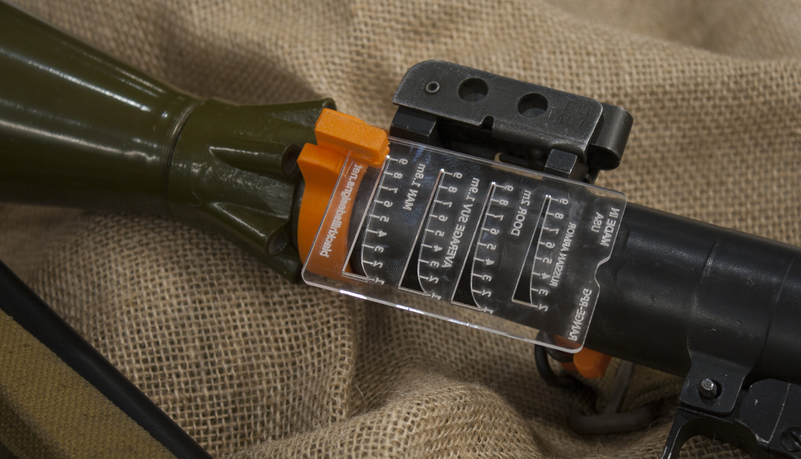 With the patent pending Black Hills Designs RANGE-R Card and mount your RPG-7 launcher is now equipped with a passive range finding solution for both anti-vehicle and anti-structure usage. The included folding card mount and custom ½ size RANGE-R card stows effortlessly around the front of the launcher and can be used with or without the PGO-7 optic. Custom cards are available and sighting with the card does not require shifting of your launcher. The RPG7 Specific card includes slots for Russian/Soviet armored vehicles, Civilian vehicles, Doors and Individuals.